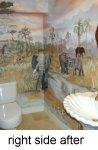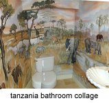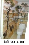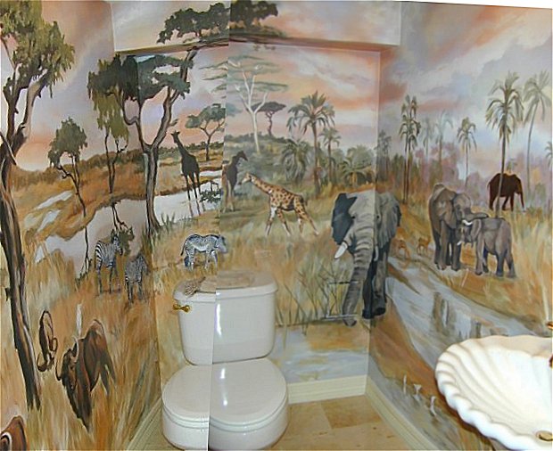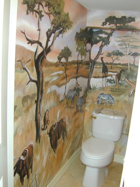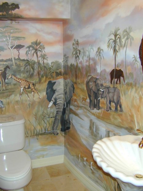 Ken Allen is an Adventurer and Photographer and world travelled. He wanted to transform his small half bathroom into a more spacious feeling area with a surrounding mural of the jungles of Tanzania filled with wildlife.
