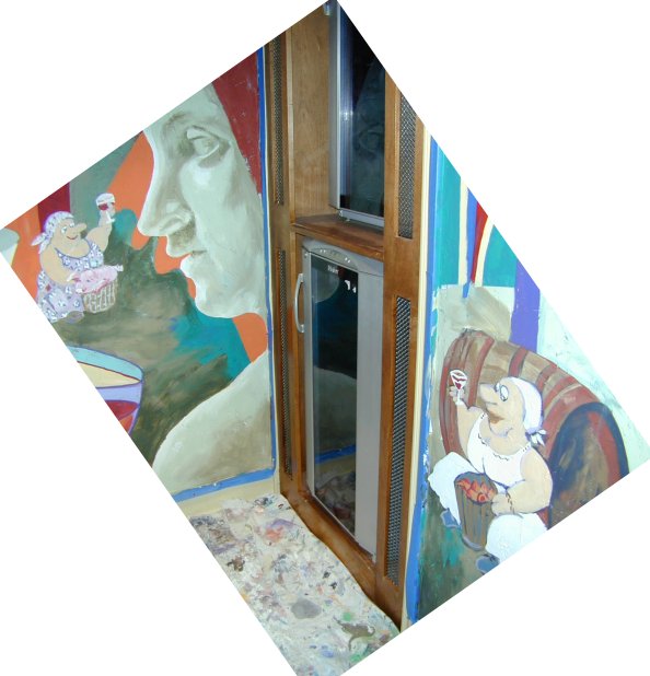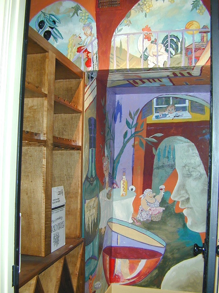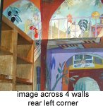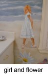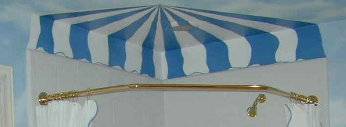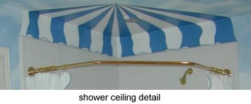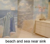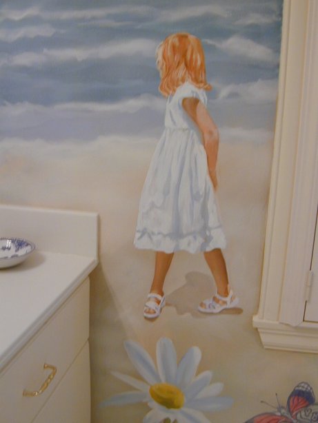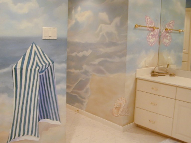 This little girl's bathroom illustrates an oceanscape with her portrait looking out to the horizon. It also includes a ceiling illustion of a cabana top over her shower / child's tub. Further around the corner, the beach and clouds start to become her favorite toys and animals.