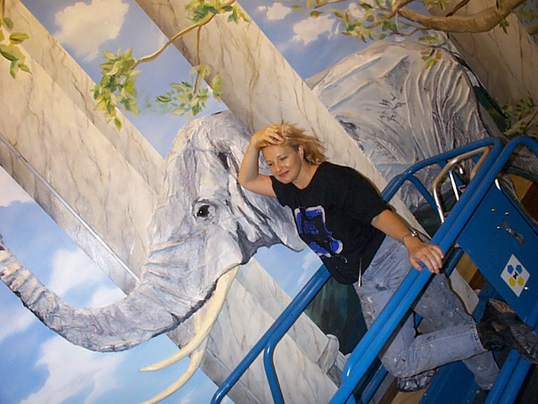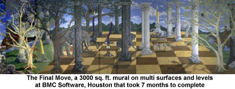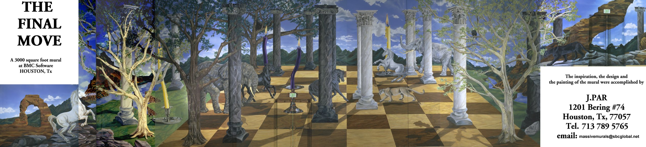 The Final Move. A 3000 square foot mural over multiwalls at different levels at BMC Software, Houston. This represents the famous chess match between Gary Kasparov, the world champion, against Deep Blue, the IBM computer, with Deep Blue the winner. The final board position of the match is depicted on a western U.S. wooded mesa, with chess pieces as follows: king, elephant, the king of the jungle; queen, panther, sleek and fast; bishop, candle, a guiding light; knight, horse; castle, tree, castles of the forest; pawn, column. The mural is not flat, and has raised surfaces for some animals. The mural is symbolic for a high tech corporation, computer was victorious over man. This was a huge job, that took over 7 months to complete. It was conceived by J.Par, and painted with the help of one other artist. The mural is shown via 2 images only: a photomontage of the whole work; and a pose of the artist on scaffolding with the white king and pawns as background.