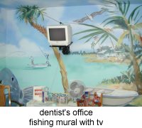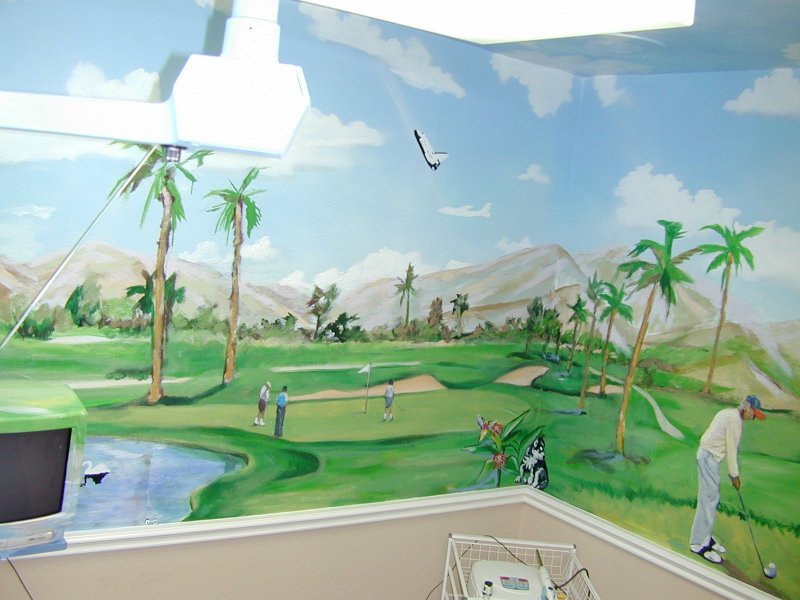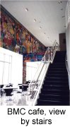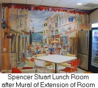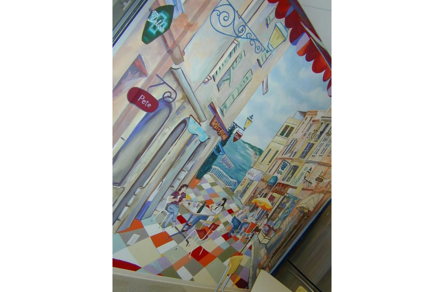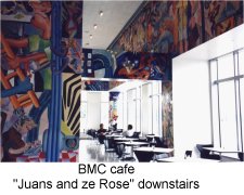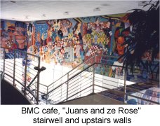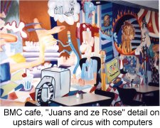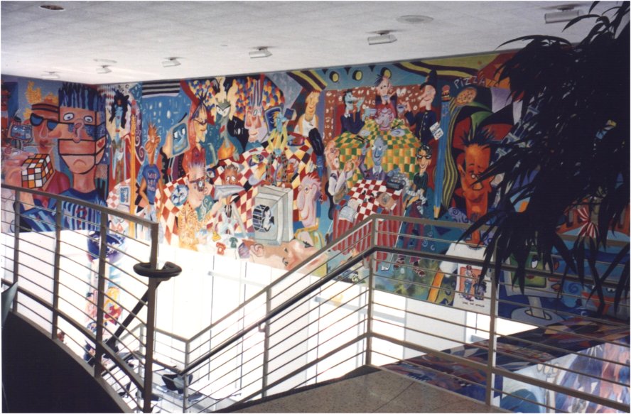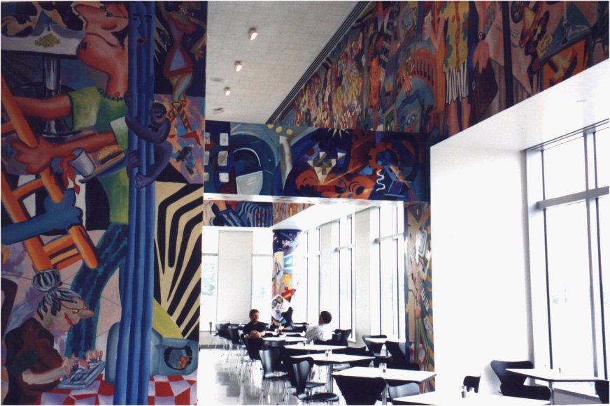 Cafe at BMC Software, Houston: A mural over 2 floors that depicts a circus in a world of animated computers. The cafe is called "Juans and Ze Rose" which is a word play on "ones and zeroes" .. the world of a software company.